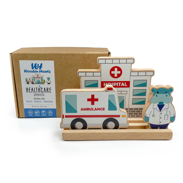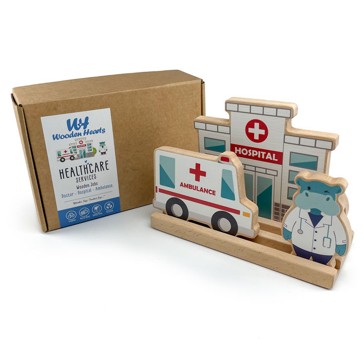 This fantastic wooden Hospital Playset is perfect for emergency-themed play. The boxed set includes four pieces: a doctor, an ambulance, and a hospital, all designed to sit comfortably on the floor. Open the doors to a world filled with learning and empathy, immersing young minds in the world of community helpers. Each playset is designed to encourage exploration and understanding of vital roles that make our world safer and better, from life-saving doctors to brave firefighters.