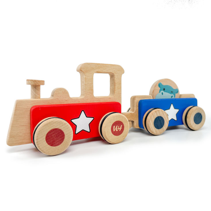 All aboard the train! A steam locomotive and three colorful passenger cars connect with magnetic connectors. Leo, Hippo, and Cocco are traveling in the brightly painted and beautifully crafted train cars. With soft wheels, it glides smoothly over any surface. The train is departing...
